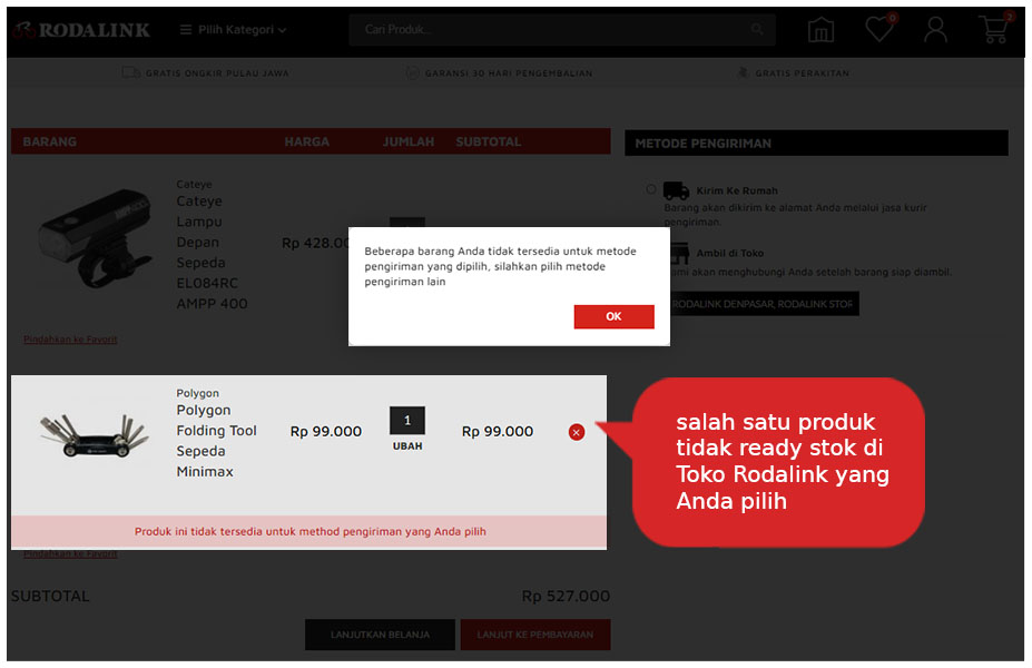Hal ini disebabkan terdapat salah satu produk dikeranjang belanja Anda yang tidak ready stok di Outlet Rodalink yang Anda inginkan. Anda tetap dapat membeli produk-produk yang Anda inginkan melalui metode "Kirim ke Rumah".