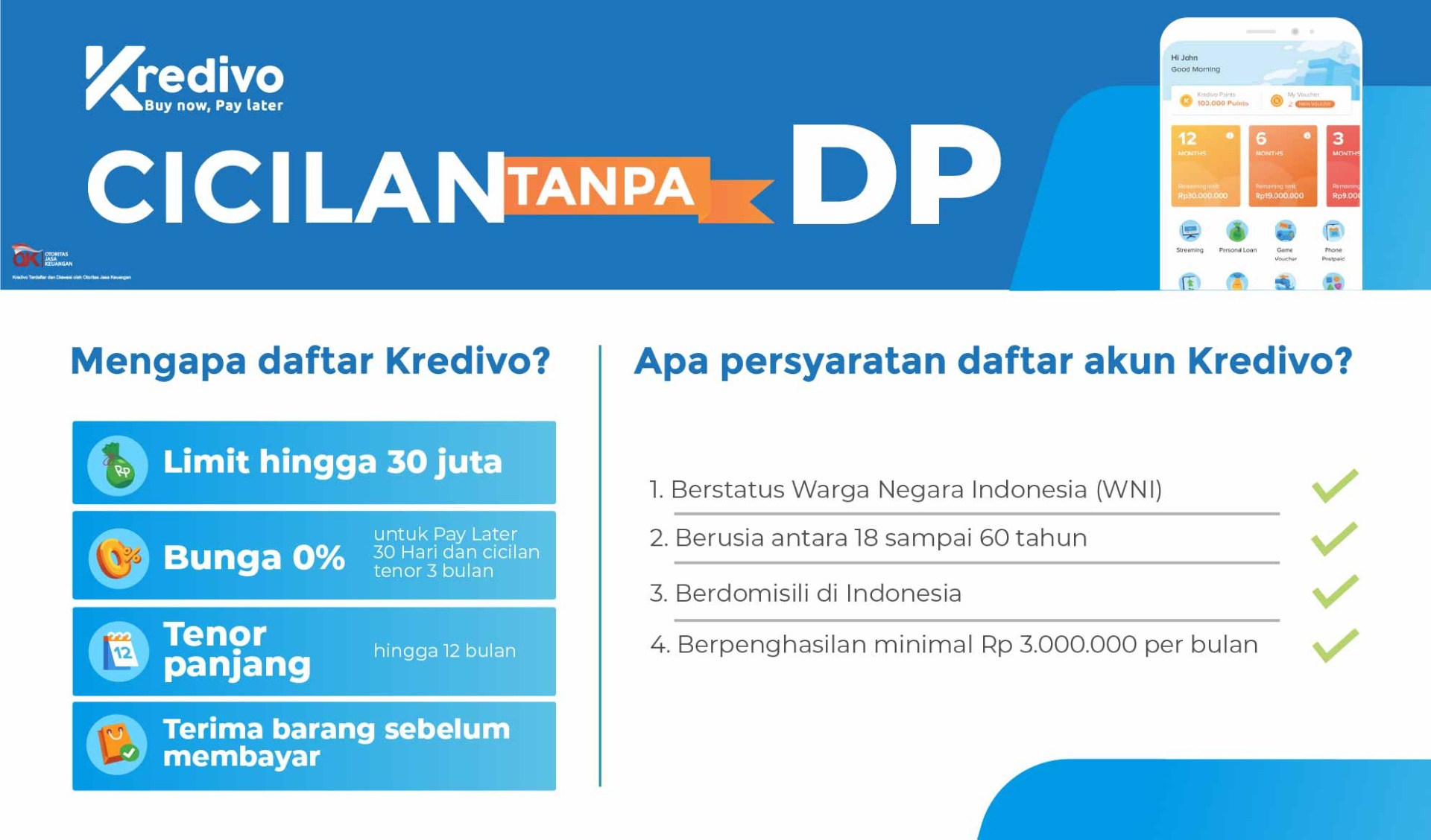 Kredivo adalah solusi kredit instan yang memberikan Anda kemudahan untuk beli sekarang dan bayar nanti dalam 30 hari/cicilan 3 bulan tanpa bunga atau dengan cicilan 6 bulan/12 bulan (bunga 2.6% per bulan). Pendaftaran hanya 5 menit, tanpa survei, dan aplikasi kreditmu akan diproses dalam waktu kurang lebih 1 x 24 jam. - Bagaimana cara mendaftar di Kredivo?