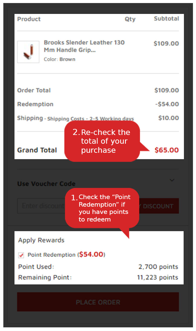 Redemption can be done with a multiple of $1 (50 points is redeemable to $1) with a maximum discount of 50% of your total purchase.+ The illustration of Point Redemption on Rodalink.com/sg:Point Information Before Purchase Your Current Point 530 points Point Conversion to SGD $ 10,6 Order Product Price Lamp $ 10 Bottle $ 5 Subtotal $ 15 Maximum Redemption ($)